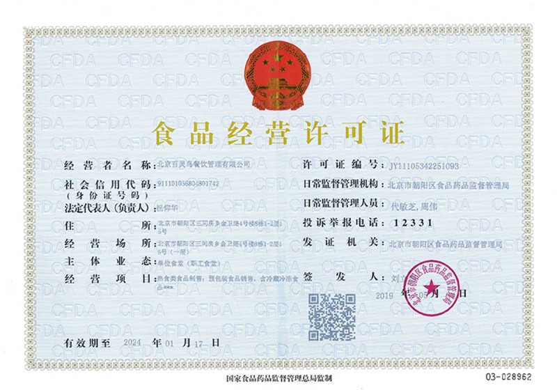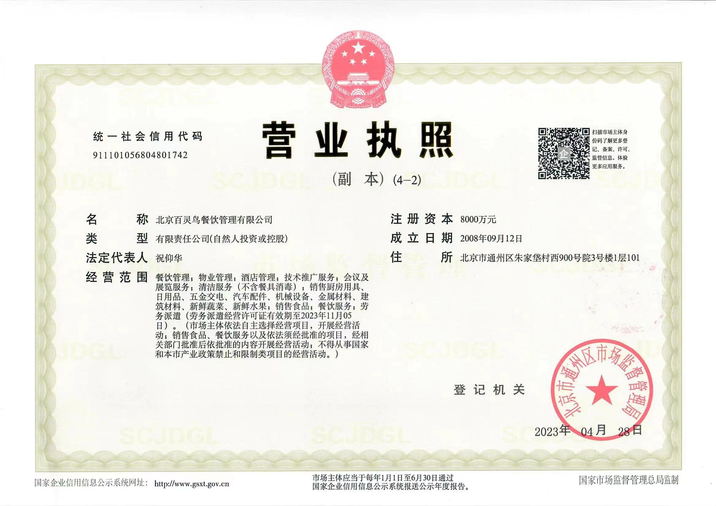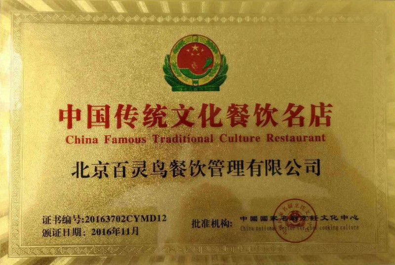 北京百靈鳥餐飲管理有限公司榮譽資質證書展示